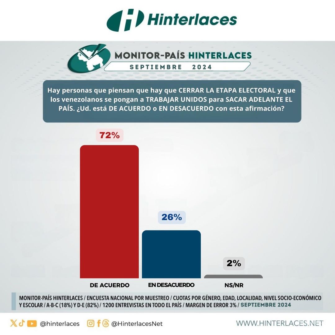 Este estudio evidenció que el 72 % de los venezolanos está de acuerdo en que es hora de cerrar la etapa electoral del pasado 28J, aceptar resultados y trabajar juntos, tanto gobierno como oposición para el desarrollo y bienestar de Venezuela.