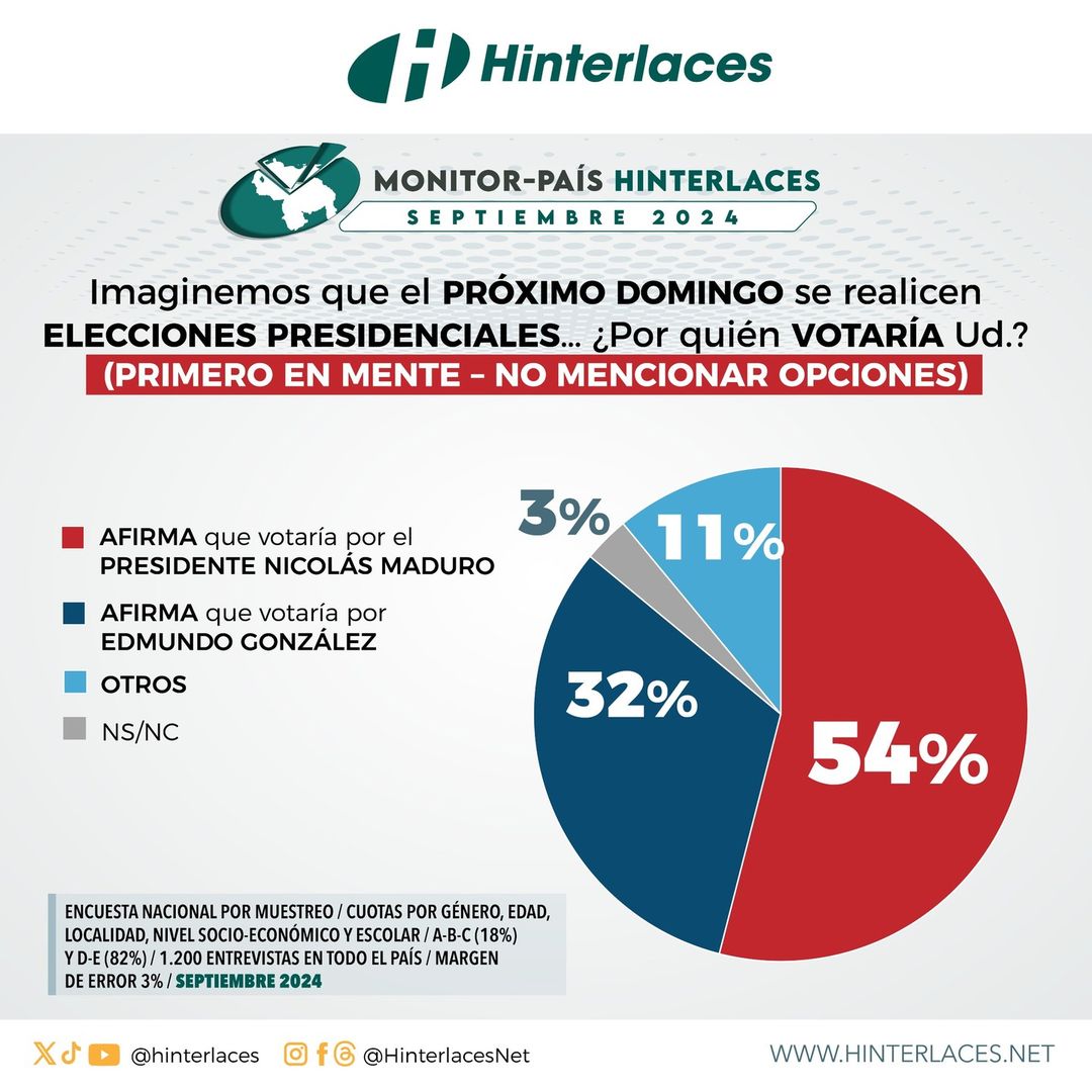 En un escenario en el que las elecciones se realizaran en este mismo fin de semana, la intención de voto indicó que un 54 % votaría nuevamente por Nicolás Maduro, y solo un 32 % por Edmundo González.