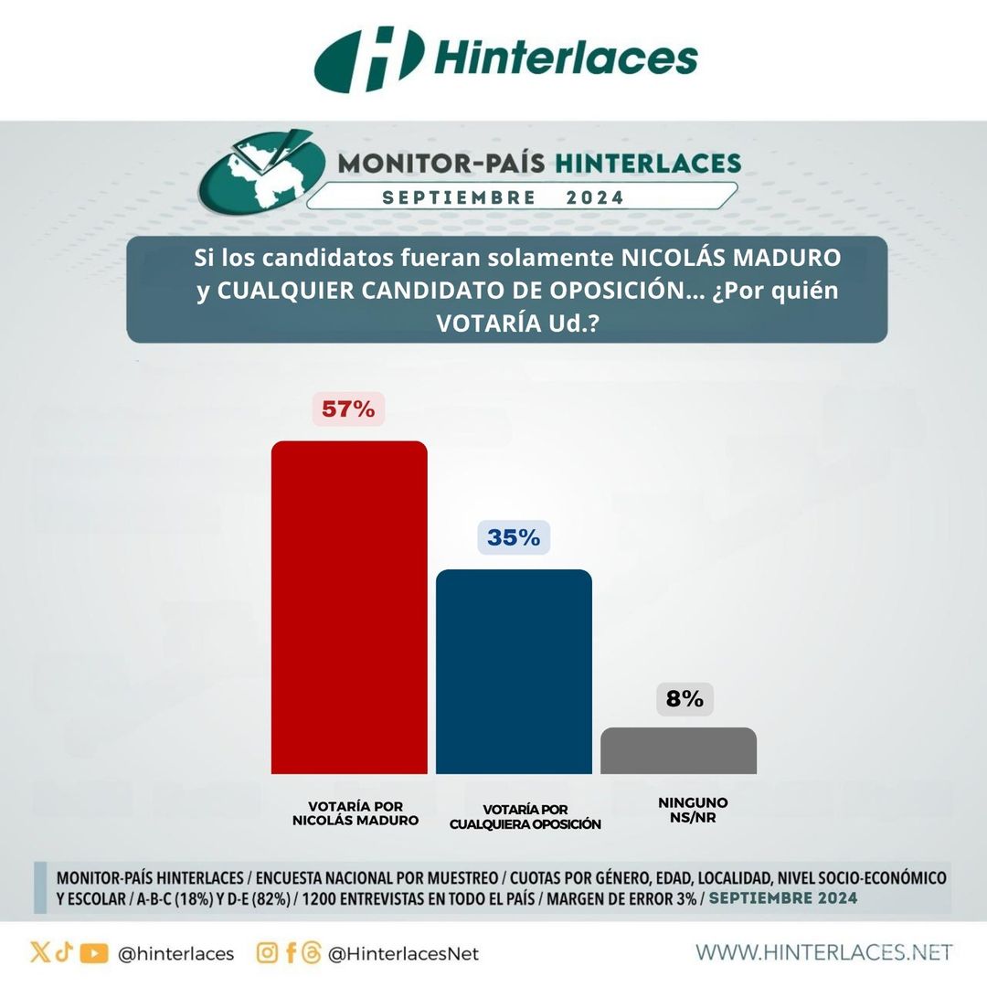 El estudio quiso ahondar con respecto a esta inquietud y planteó un escenario en el que solo los candidatos únicamente estarían representados por Nicolás Maduro y cualquier candidato de oposición. Una vez más el 57 % votaría por el actual jefe de Estado y el 35 % por la oposición.