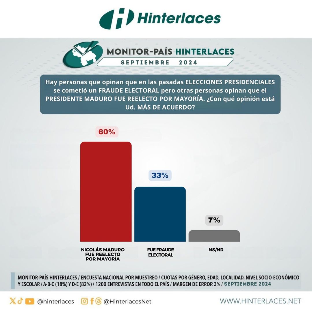 Con respecto a las elecciones presidenciales pasadas, el 60 % de los venezolanos está de acuerdo en que el presidente Nicolás Maduro quedó reelegido por mayoría, mientras que un 33 % cree que hubo fraude electoral.