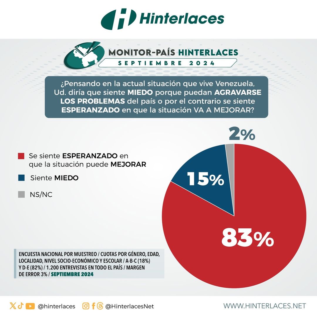 En otro sondeo, Hinterlaces recogió la información sobre los sentimientos sobre el futuro del país, en los que un 83 % de los encuestados siente que hay esperanza en que la situación de Venezuela mejorará, mientras que un 15 % siente miedo ante un posible empeoramiento.