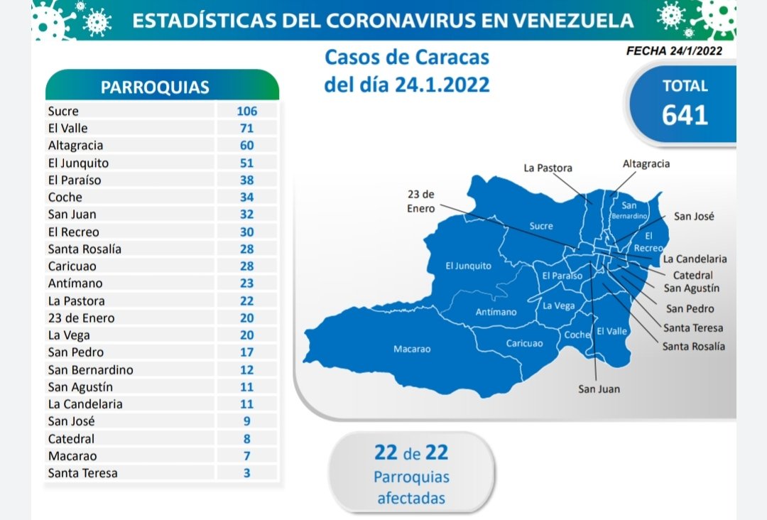 Caracas vuelve a ser la entidad donde se detectaron más nuevos contagios comunitarios (641), con casos activos en todas sus parroquias; entre las cuales destaca Sucre, donde se concentran casi todos los casos y los demás a continuación en las imágenes.