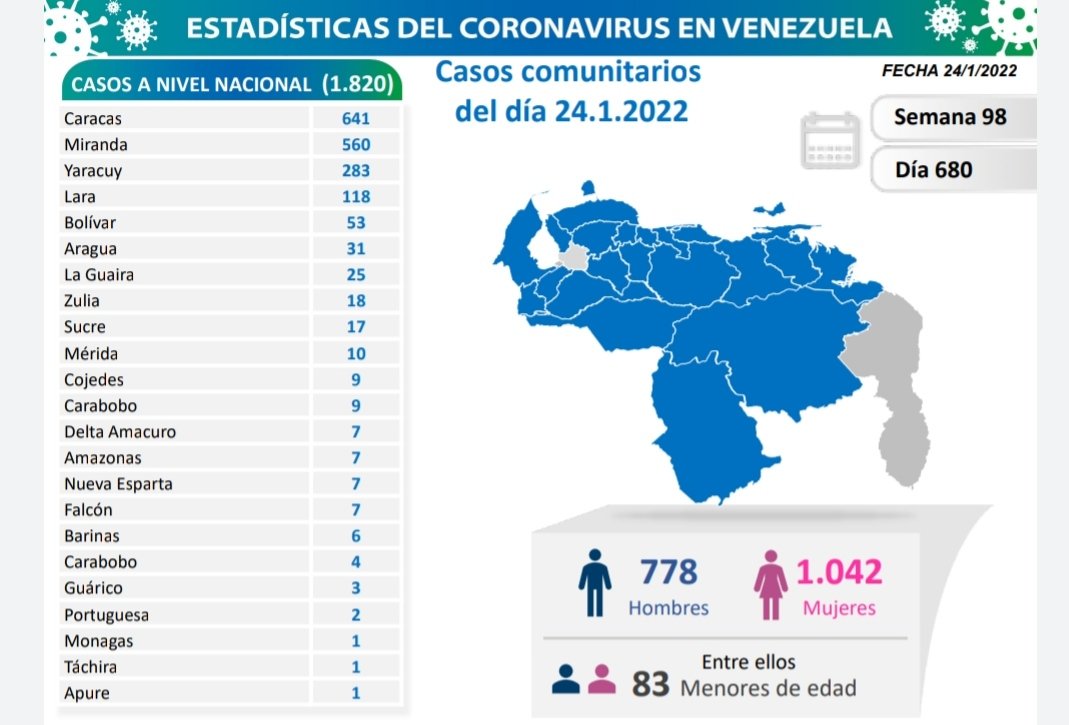 Este lunes 24 de enero se cumplió el día 680 de pandemia en Venezuela y la nación reporta en las últimas 24 horas 1.823 nuevos contagios por covid-19, 1.820 por transmisión comunitaria y 3 importados; además de 5 muertes. Así lo informó el ministro de comunicación e información, Alfred Nazareth Ñáñez, vía Twitter.