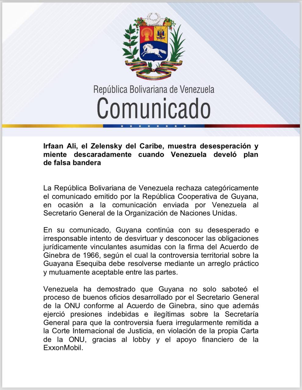La República Bolivariana de Venezuela exige a la República Cooperativa de Guyana cesar sus campañas de mentiras y cumplir estrictamente el Acuerdo de Ginebra, como único camino válido para la solución definitiva, pacífica y satisfactoria para ambas partes sobre el territorio de la Guayana Esequiba.