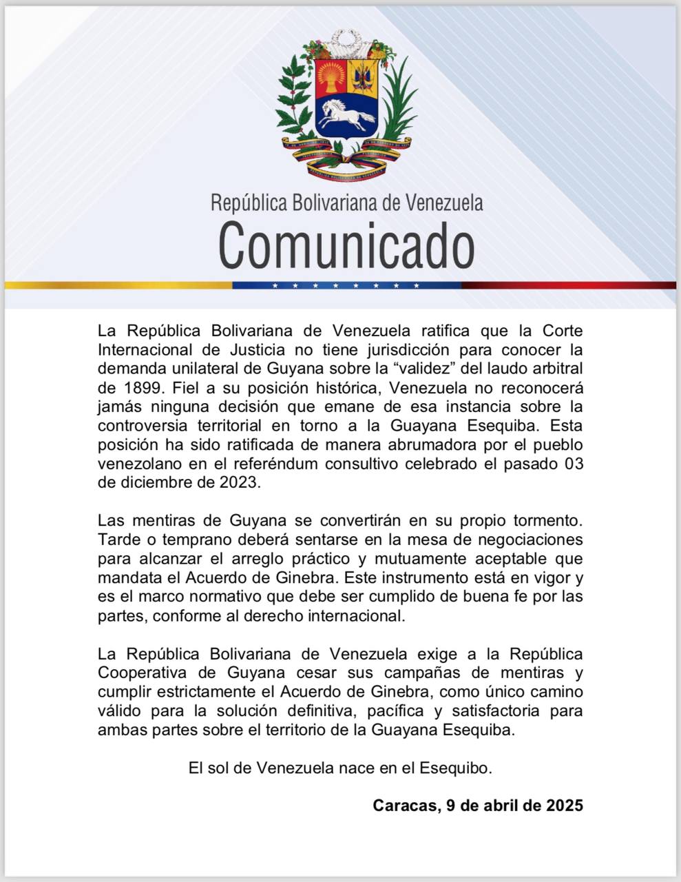 La República Bolivariana de Venezuela ratifica que la Corte Internacional de Justicia no tiene jurisdicción para conocer la demanda unilateral de Guyana sobre la «validez» del laudo arbitral de 1899. Fiel a su posición histórica, Venezuela no reconocerá jamás ninguna decisión que emane de esa instancia sobre la controversia territorial en torno a la Guayana Esequiba. Esta posición ha sido ratificada de manera abrumadora por el pueblo venezolano en el referéndum consultivo celebrado el pasado 03 de diciembre de 2023.