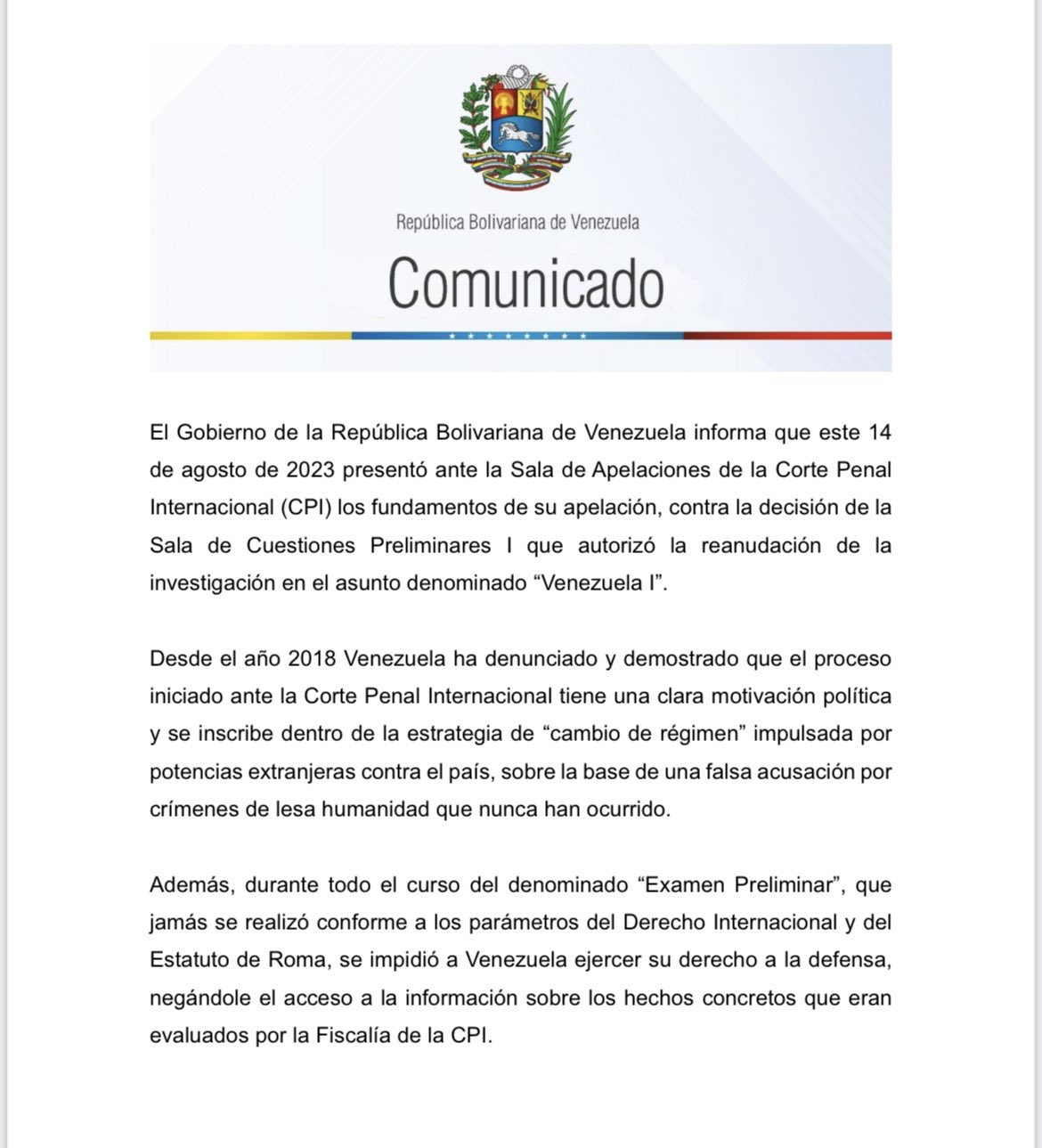 El Gobierno de la República Bolivariana de Venezuela informa que este 14 de agosto de 2023 presentó ante la sala de apelaciones de la Corte penal internacional (CPI) los fundamentos de su apelación, contra la decisión de la Sala de Cuestiones Preliminares I, que autorizó la reanudación de la investigación en el asunto denominado «Venezuela I».