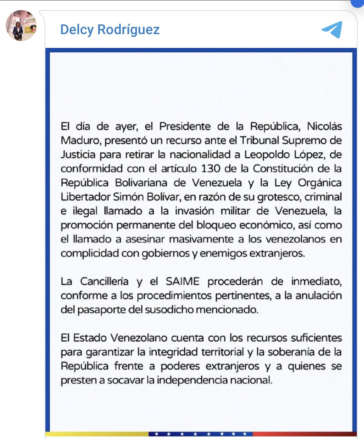 Como parte del procedimiento, el Ejecutivo instruyó a la Cancillería y al Servicio Administrativo de Identificación, Migración y Extranjería (Saime) para que inicien la anulación del pasaporte de López. El Estado venezolano ratificó que cuenta con los recursos paragarantizar la integridad territorial y la soberanía de la República.