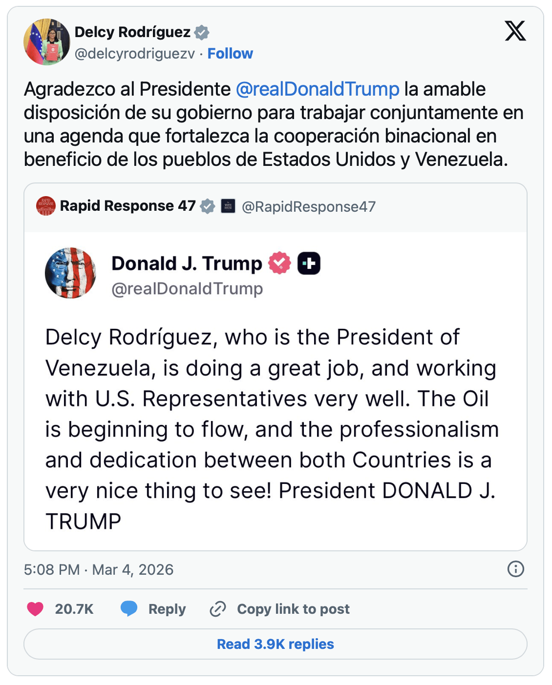 Por su parte, la presidenta Delcy Rodríguez respondió con prontitud a través de su cuenta en la plataforma X, consolidando así la importancia de estos mensajes en la diplomacia digital contemporánea. «Agradezco al presidente Donald Trump la amable disposición de su Gobierno para trabajar conjuntamente en una agenda que fortalezca la cooperación binacional», expresó la funcionaria.