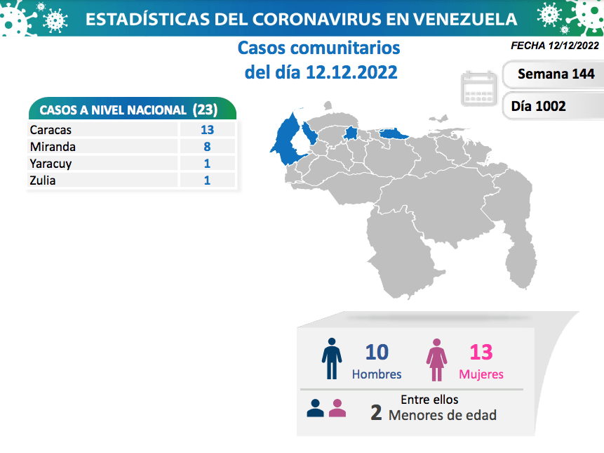 La Comisión Presidencial para la Prevención, Atención y Control de la Covid-19 informó este 12 de diciembre cómo se encuentra Venezuela para el día 1.002 en pandemia. Igualmente exhortó a la población venezolana a recibir la dosis de refuerzo de la vacuna anticovid de forma gratuita, retomar y reforzar medidas de bioseguridad.