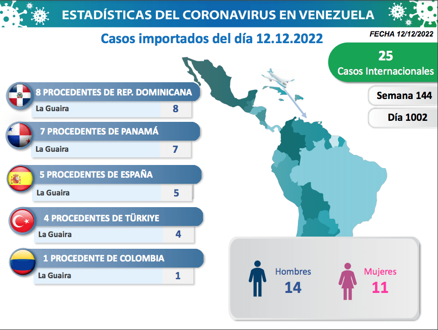 Los casos comunitarios de covid-19 en Venezuela se registraron en varios estados resultando Caracas donde aparecen más contagiados para esta fecha. En esta oportunidad, hubo 25 casos importados. Provenientes de República Dominicana, Panamá, España, Türkiye y Colombia, todos con entrada por La Guaira.