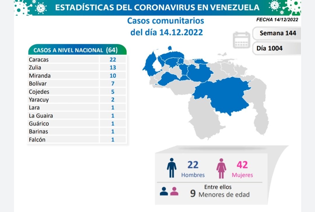 La Comisión Presidencial para la Prevención, Atención y Control de la Covid-19 informó este 14 de diciembre cómo se encuentra Venezuela para el día 1.004 en pandemia. Igualmente exhortó a la población venezolana a recibir la dosis de refuerzo de la vacuna anticovid de forma gratuita, retomar y reforzar medidas de bioseguridad.
