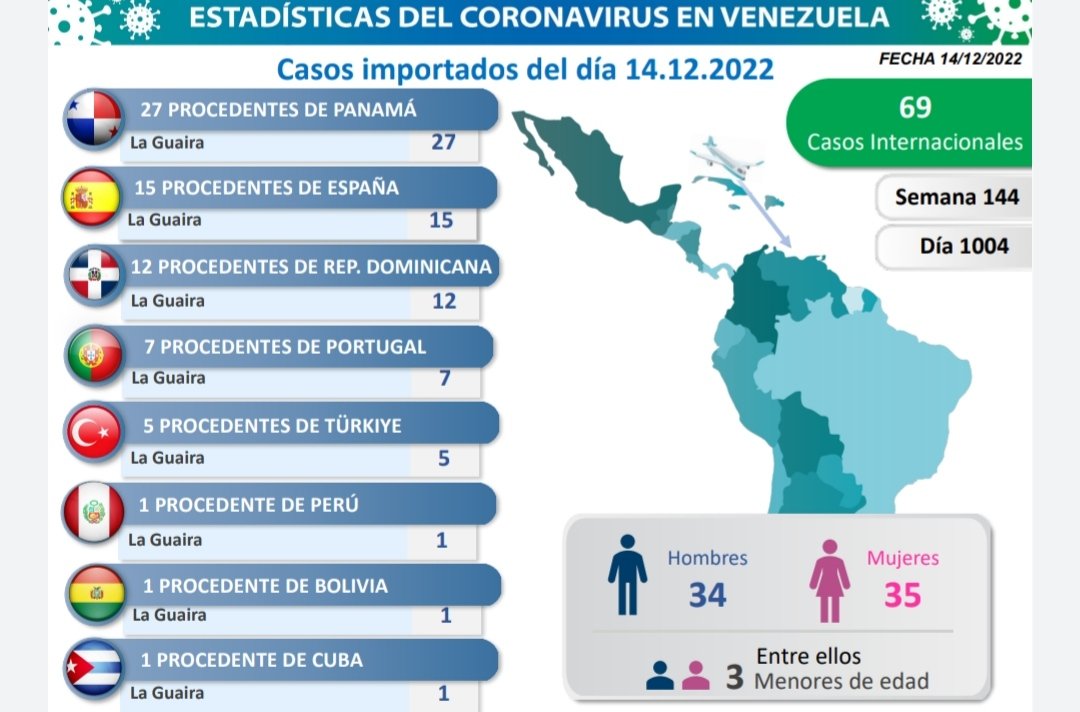 Los casos comunitarios de covid-19 en Venezuela se registraron en varios estados resultando Caracas donde aparecen más contagiados para esta fecha. En esta oportunidad, hubo 69 casos importados. Provenientes de Panamá, España, República Dominicana, Portugal, Türkiye, Perú, Bolivia y Cuba, todos con entrada por La Guaira.