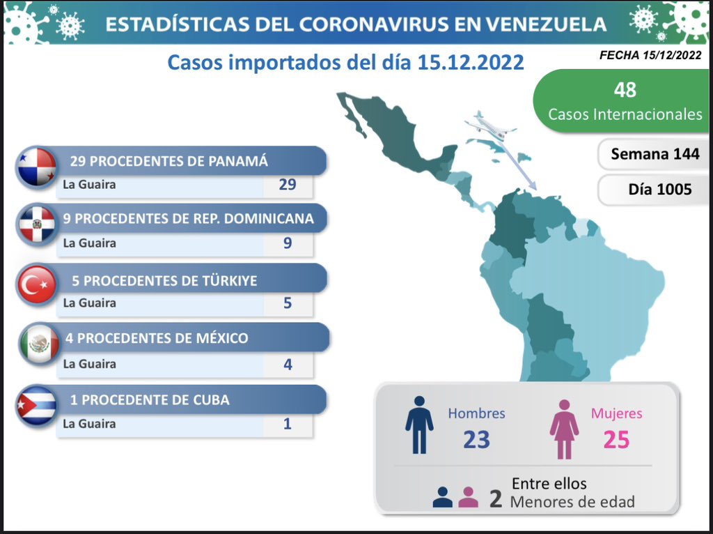 Los casos comunitarios de covid-19 en Venezuela se registraron en varios estados resultando Caracas donde aparecen más contagiados para esta fecha. En esta oportunidad, hubo 48 casos importados. Provenientes de Panamá, República Dominicana, Türkiye, México y Cuba, todos con entrada por La Guaira.