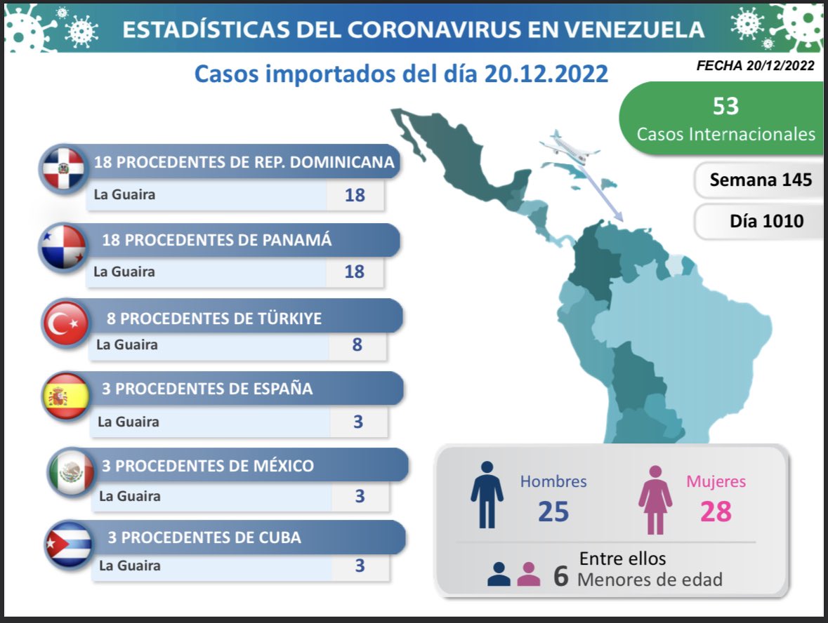 Los casos comunitarios de covid-19 en Venezuela se registraron en varios estados resultando Caracas donde aparecen más contagiados para esta fecha. En esta oportunidad, hubo 53 casos importados. Provenientes de República Dominicana, Panamá, Türkiye, España, México y Cuba, todos con entrada por La Guaira.