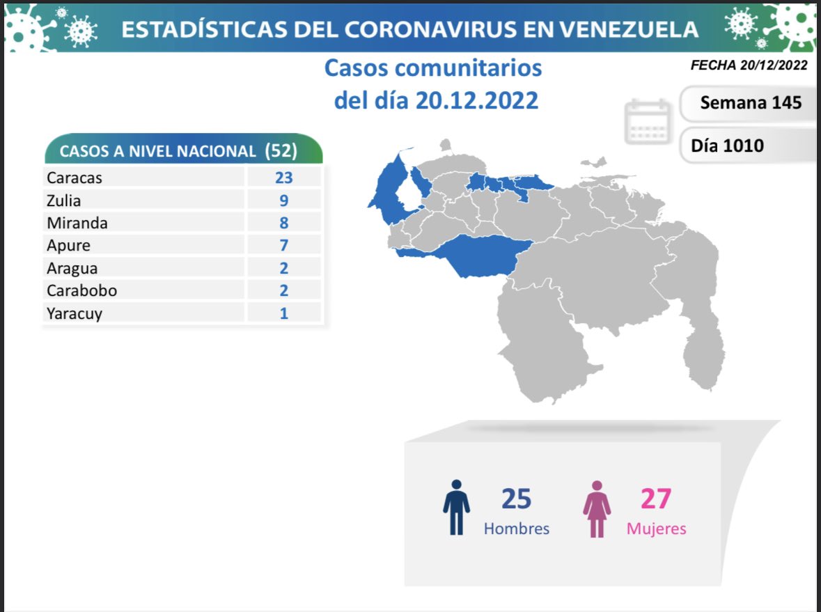 La Comisión Presidencial para la Prevención, Atención y Control de la Covid-19 informó este 20 de diciembre cómo se encuentra Venezuela para el día 1.010 en pandemia. Igualmente exhortó a la población venezolana a recibir la dosis de refuerzo de la vacuna anticovid de forma gratuita, retomar y a no relajar las medidas de bioseguridad.