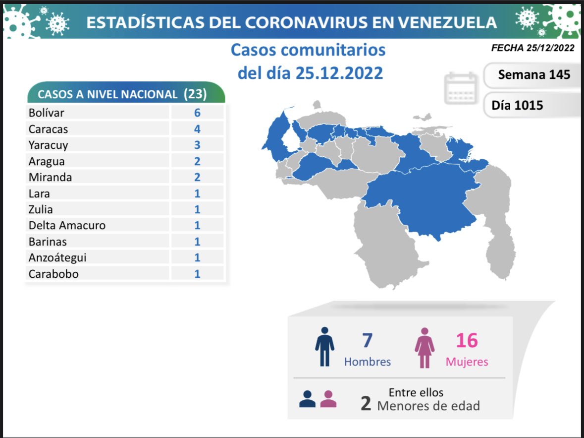 La Comisión Presidencial para la Prevención, Atención y Control de la Covid-19 informó este 25 de diciembre cómo se encuentra Venezuela para el día 1.015 en pandemia. Igualmente exhortó a la población venezolana a recibir la dosis de refuerzo de la vacuna anticovid de forma gratuita, retomar y a no relajar las medidas de bioseguridad.