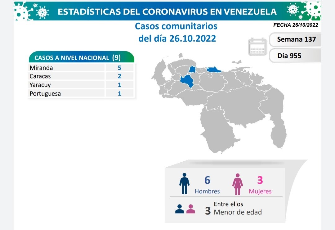 A través de las redes sociales, la Comisión Presidencial para la Prevención, Atención y Control de la Covid-19 informaron este 26 de octubre cómo se encuentra Venezuela para el día 955 en pandemia. Igualmente exhorta a la población venezolana a recibir la dosis de refuerzo de la vacuna anticovid, retomar y reforzar medidas de bioseguridad.