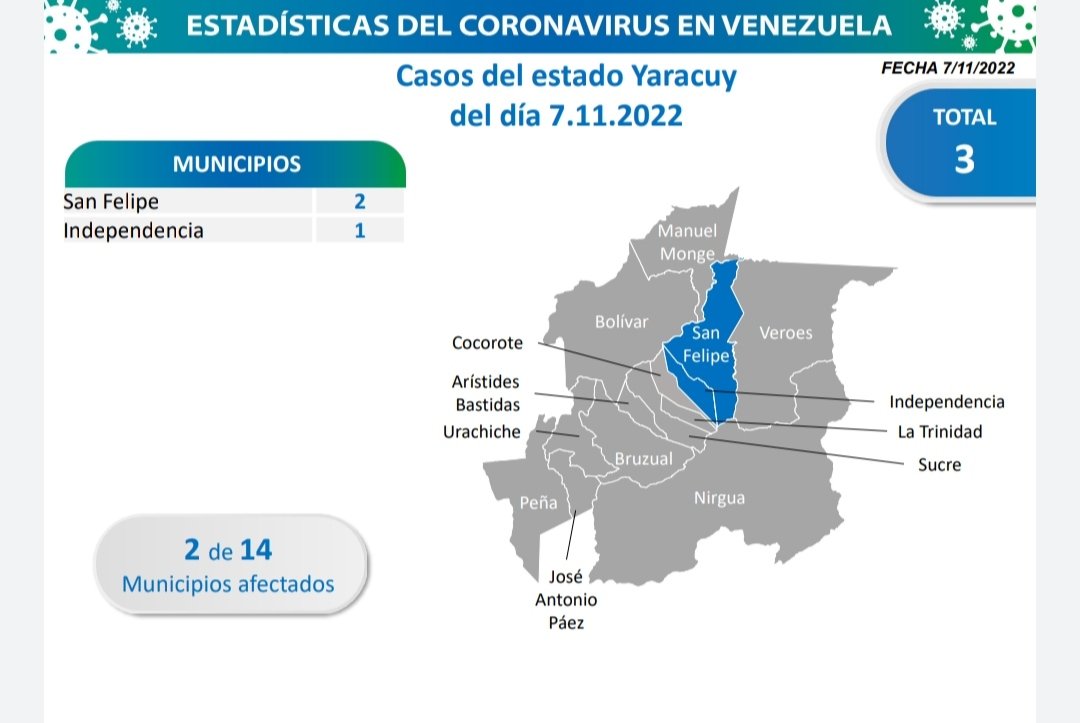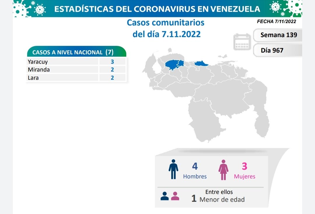 Los casos comunitarios de covid-19 en Venezuela se registraron en 3 estados y Yaracuy es donde aparecen más contagiados para esta fecha. En esta oportunidad, hubo 5 casos importados. Se trata de 1 que viene desde República Dominicana, 2 desde España, 1 desde Panamá y 1 desde Türkiye, todos con entrada por La Guaira.