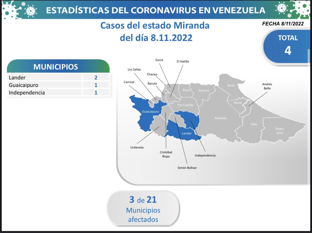 Los casos comunitarios de covid-19 en Venezuela se registraron en 3 estados y Miranda es donde aparecen más contagiados para esta fecha. En esta oportunidad, hubo 7 casos importados. Se trata de 3 hombres y 4 mujeres que vienen desde Panamá, España, México y Türkiye, todos con entrada por La Guaira.