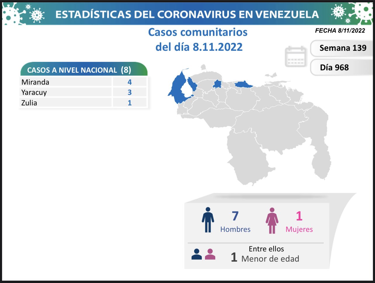 A través de las redes sociales, la Comisión Presidencial para la Prevención, Atención y Control de la Covid-19 informaron este 08 de noviembre cómo se encuentra Venezuela para el día 968 en pandemia. Igualmente exhorta a la población venezolana a recibir la dosis de refuerzo de la vacuna anticovid de forma gratuita, retomar y reforzar medidas de bioseguridad.