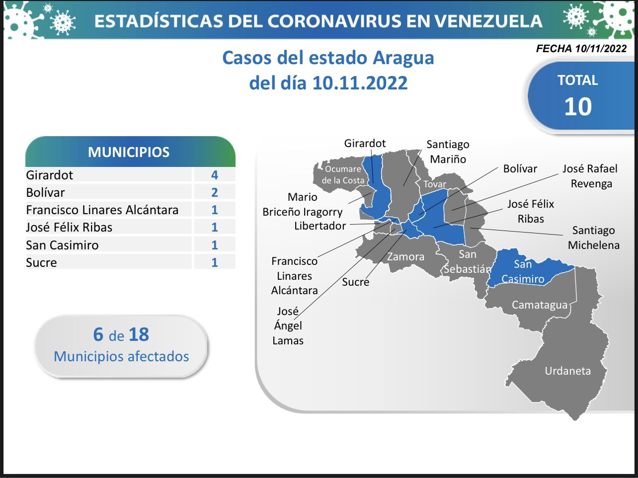 La entidad donde están los nuevos casos comunitarios de las últimas 24 horas es Aragua con 10 contagios activos; tal y como se detalla en la siguiente gráfica.
