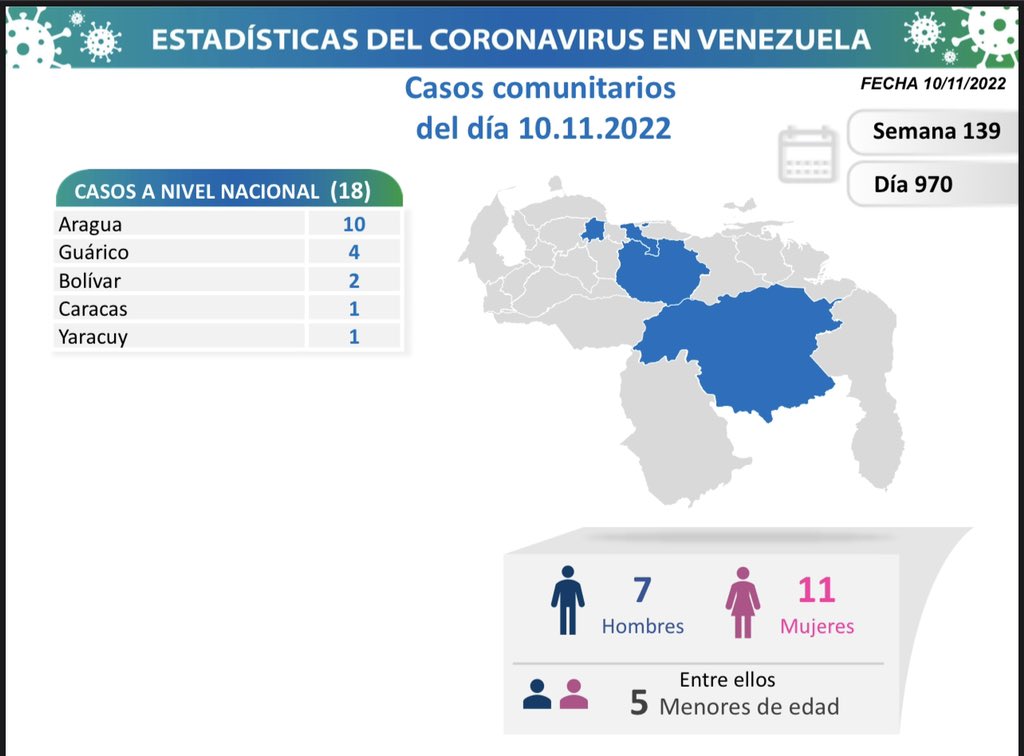 A través de las redes sociales, la Comisión Presidencial para la Prevención, Atención y Control de la Covid-19 informaron este 10 de noviembre cómo se encuentra Venezuela para el día 970 en pandemia. Igualmente exhorta a la población venezolana a recibir la dosis de refuerzo de la vacuna anticovid de forma gratuita, retomar y reforzar medidas de bioseguridad.