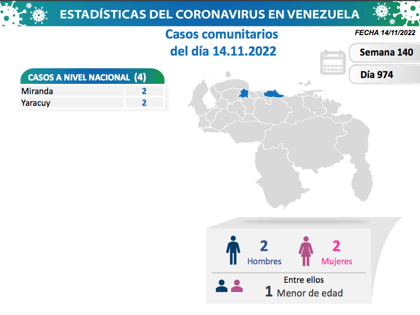 A través de las redes sociales, la Comisión Presidencial para la Prevención, Atención y Control de la Covid-19 informaron este 14 de noviembre cómo se encuentra Venezuela para el día 974 en pandemia. Igualmente exhorta a la población venezolana a recibir la dosis de refuerzo de la vacuna anticovid de forma gratuita, retomar y reforzar medidas de bioseguridad.