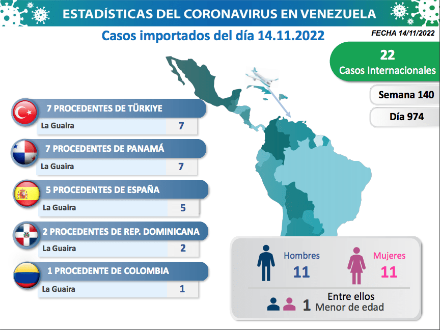 Por último, desde la Comisión Presidencial envían un mensaje a la ciudadanía donde detallan que «De los 22 casos importados, 7 vienen desde Panamá, 2 desde República Dominicana, 7 de Türkiye, 5 desde España, 1 desde Colombia, todos con entrada por La Guaira».