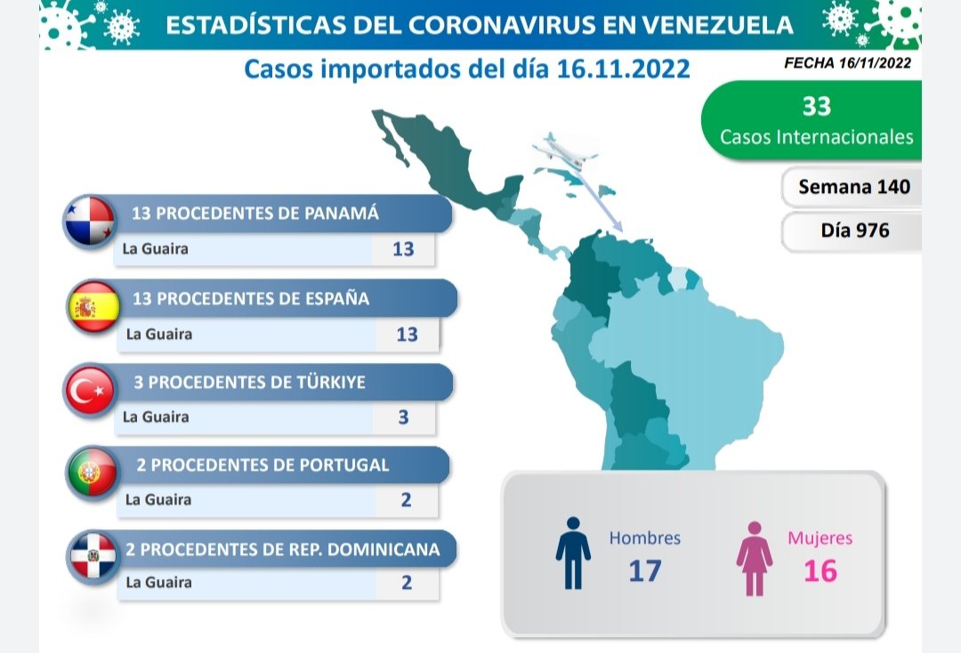 Los casos comunitarios de covid-19 en Venezuela se registraron en 4 estados y Caracas es donde aparecen más contagiados para esta fecha. En esta oportunidad, hubo 33 casos importados. Provenientes de República Dominicana, Türkiye, Portugal, Panamá y España, todos con entrada por La Guaira.