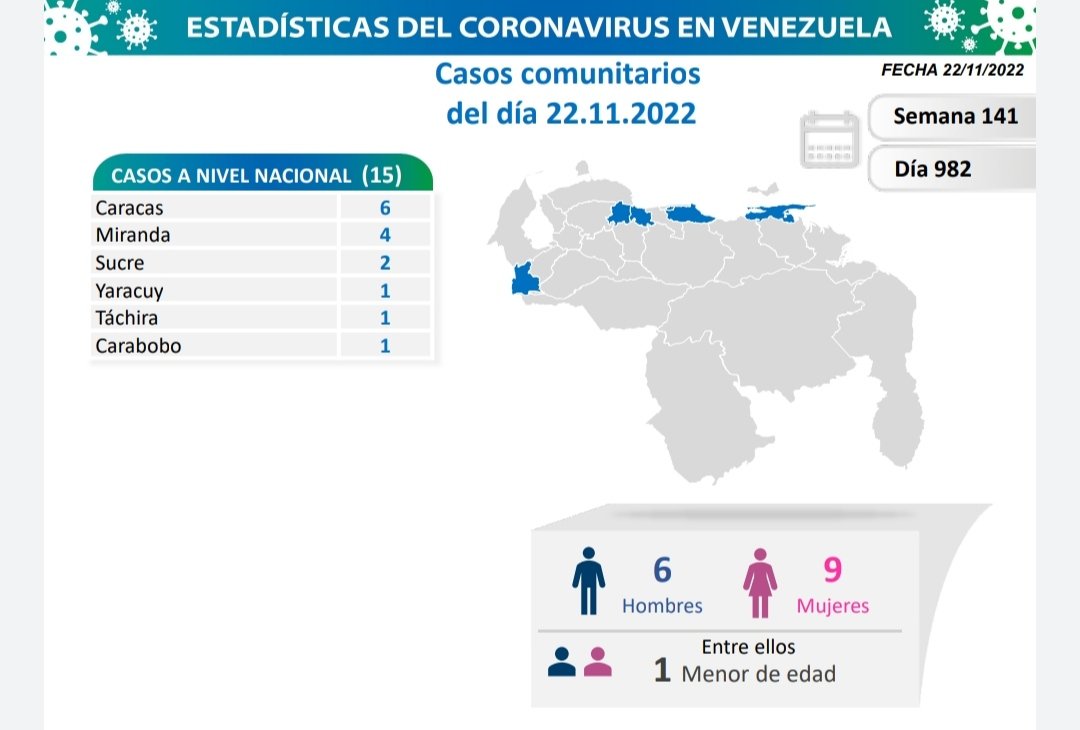 La Comisión Presidencial para la Prevención, Atención y Control de la Covid-19 informó este 22 de noviembre cómo se encuentra Venezuela para el día 982 en pandemia. Igualmente exhortó a la población venezolana a recibir la dosis de refuerzo de la vacuna anticovid de forma gratuita, retomar y reforzar medidas de bioseguridad.