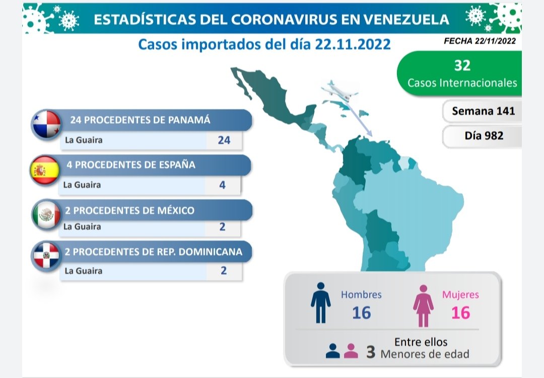 Los casos comunitarios de covid-19 en Venezuela se registraron en varios estados y Caracas es donde aparecen más contagiados para esta fecha. En esta oportunidad, hubo 32 casos importados. Provenientes de Panamá, España, México y República Dominicana, todos con entrada por La Guaira.