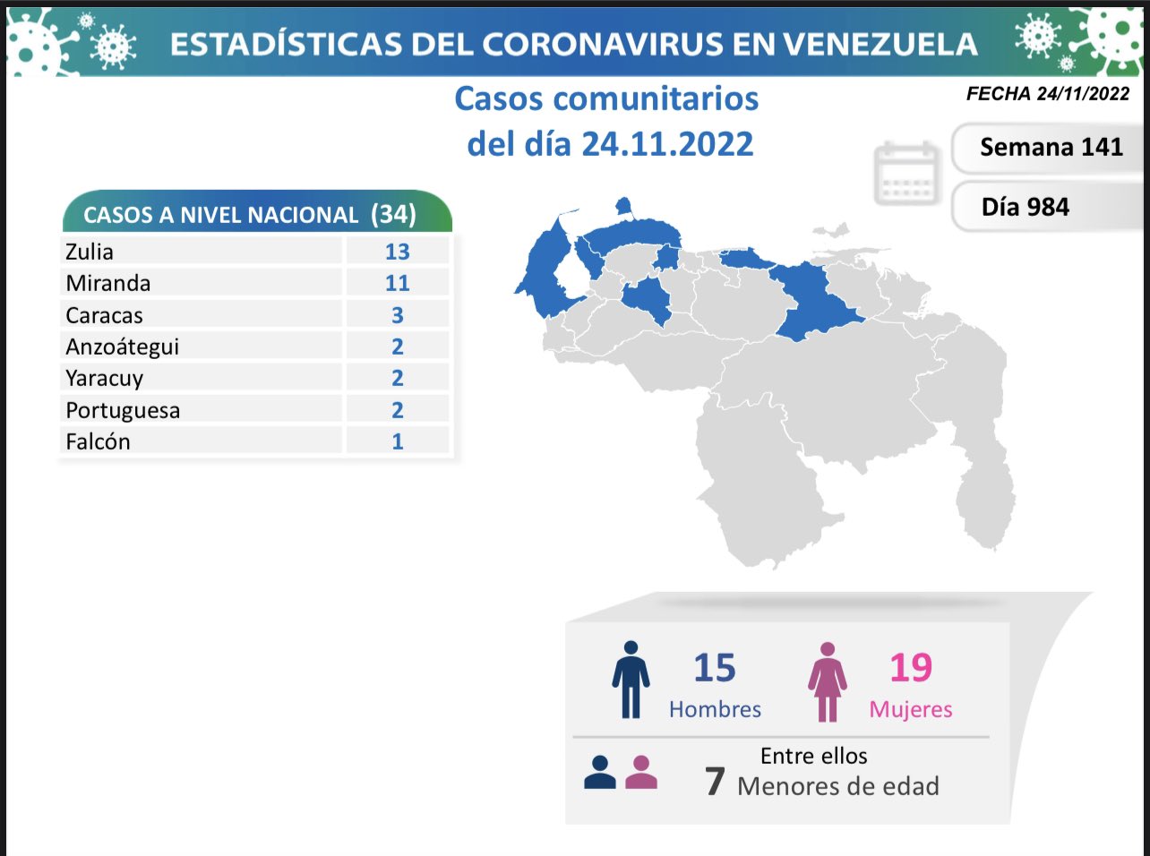 La Comisión Presidencial para la Prevención, Atención y Control de la Covid-19 informó este 24 de noviembre cómo se encuentra Venezuela para el día 984 en pandemia. Igualmente exhortó a la población venezolana a recibir la dosis de refuerzo de la vacuna anticovid de forma gratuita, retomar y reforzar medidas de bioseguridad.