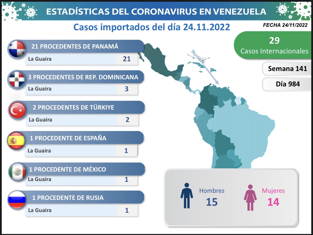 Los casos comunitarios de covid-19 en Venezuela se registraron en varios estados y Zulia es donde aparecen más contagiados para esta fecha. En esta oportunidad, hubo 29 casos importados. Provenientes de Panamá, República Dominicana, Türkiye, España, México y Rusia todos con entrada por La Guaira.