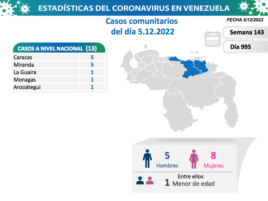 La Comisión Presidencial para la Prevención, Atención y Control de la Covid-19 informó este 05 de diciembre cómo se encuentra Venezuela para el día 995 en pandemia. Igualmente exhortó a la población venezolana a recibir la dosis de refuerzo de la vacuna anticovid de forma gratuita, retomar y reforzar medidas de bioseguridad.