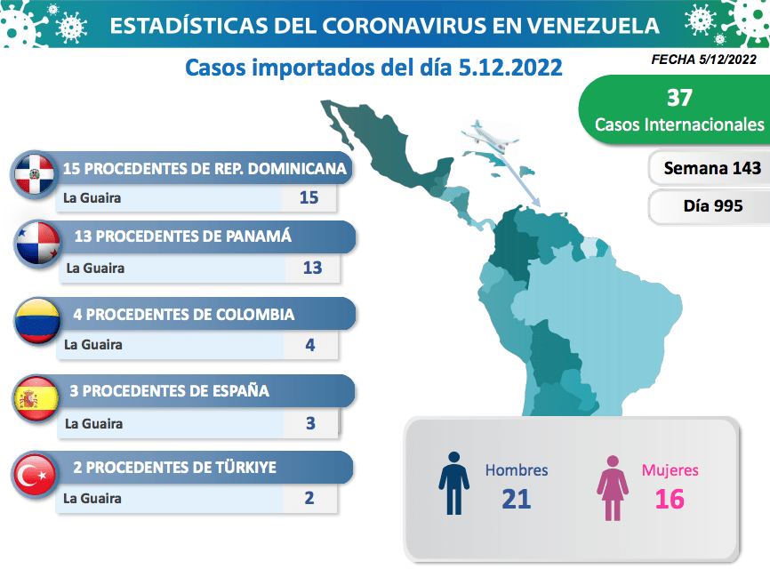 Los casos comunitarios de covid-19 en Venezuela se registraron en varios estados resultando Caracas y Miranda son donde aparecen más contagiados para esta fecha. En esta oportunidad, hubo 37 casos importados. Provenientes de República Dominicana, Panamá, Colombia, España y Türkiye todos con entrada por La Guaira.