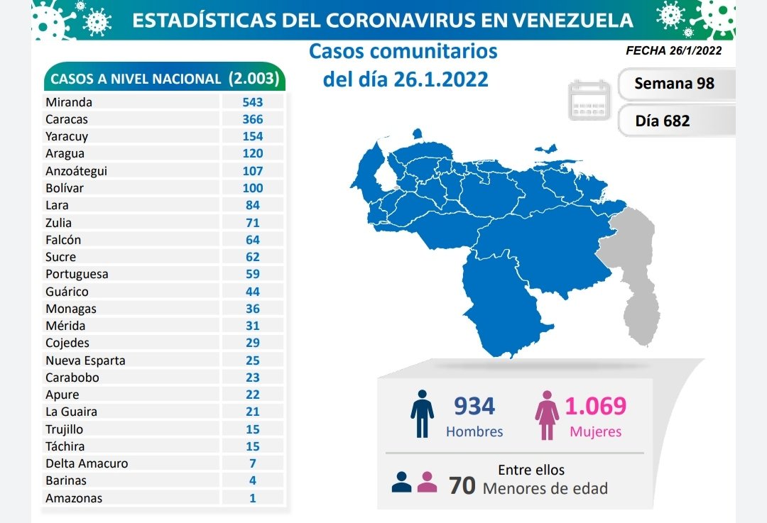 Este miércoles 26 de enero se cumplió el día 682 de pandemia en Venezuela y la nación reporta en las últimas 24 horas 2.010 nuevos contagios por covid-19, 2.003 por transmisión comunitaria y 7 importados; además de 5 muertes. Así lo informó el ministro de comunicación e información, Alfred Nazareth Ñáñez, vía Twitter.