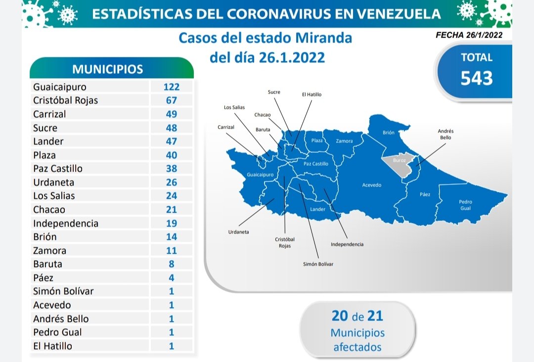 Miranda es la entidad donde se detectaron más nuevos contagios comunitarios (543), con casos activos en casi todos sus municipios; entre las cuales destaca Guaicaipuro, donde se concentran casi todos los casos y los demás a continuación en las imágenes.