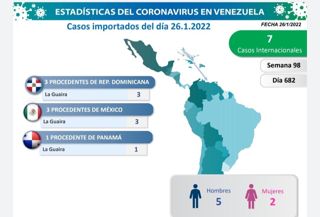 Igualmente, los 7 casos importados vienen desde República Dominicana, México y Panamá, 5 hombres y 2 mujeres, todos con entrada por La Guaira.