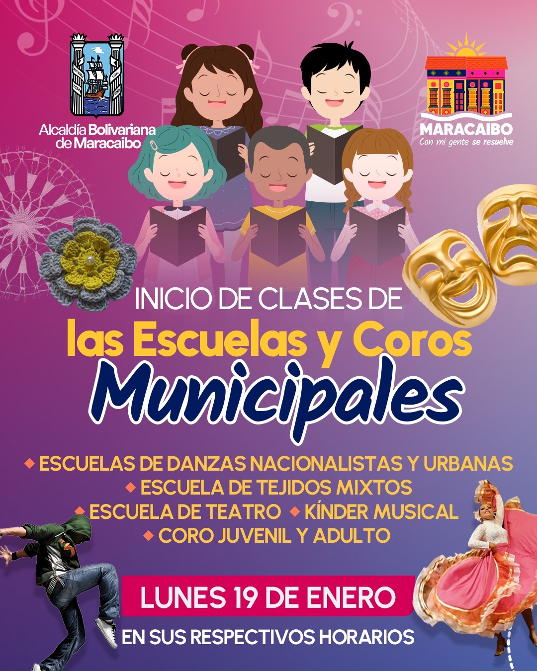La Dirección de Cultura de la Alcaldía Bolivariana de Maracaibo, anunció el inicio de clases de las Escuelas y Coros Municipales este lunes 19 de enero, en sus respectivos horarios y espacios culturales.
