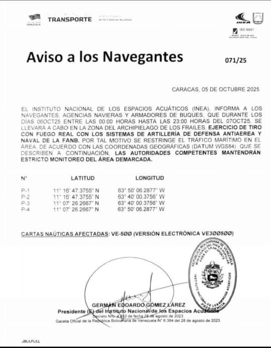 «El Instituto Nacional de los Espacios Acuáticos (INEA) -expresa el comunicado-, informa a los navegantes, agencias navieras y armadores de buques que durante los días 6 y 7 de octubre, llevará a cabo en la zona del Archipiélago de Los Frailes, un ejercicio de tiro con fuego real, con los sistemas de artillería de defensa antiaérea y naval de la FANB».