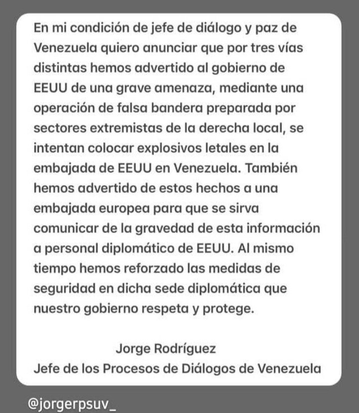 Las acciones previstas en los protocolos de Defensa Integral venezolano, adquiere singular importancia, cuando el presidente de la Asamblea Nacional y Jefe de los Procesos de Diálogos informará sobre un presunto hecho de falsa bandera en contra de la embajada estadounidense, hecho denunciado en las redes sociales del partido socialista unido de Venezuela.