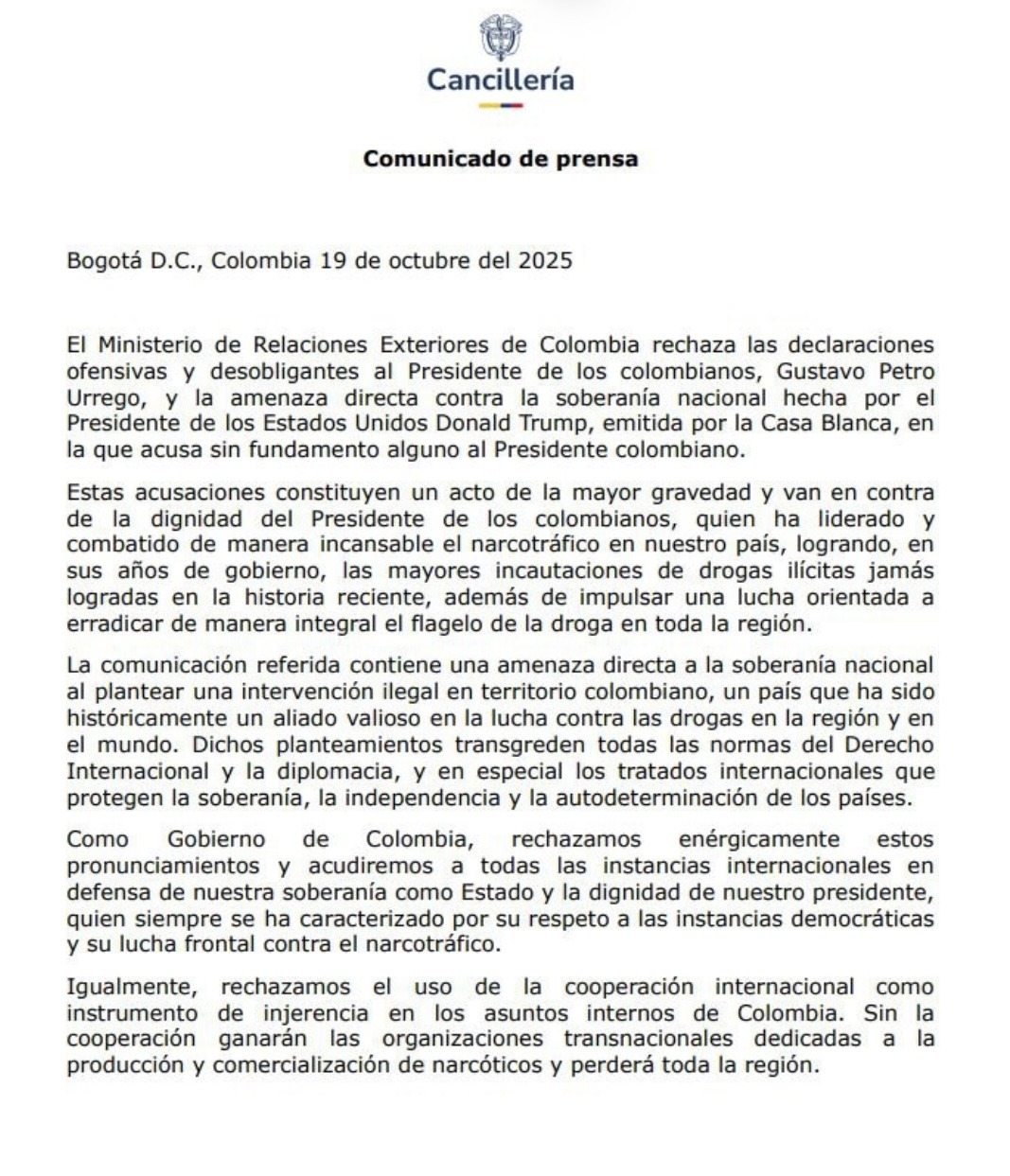 Aunado a ello, indica que la comunicación recibida por la Casa Blanca, “contiene una amenaza directa a la soberanía nacional al plantear una intervención ilegal en territorio colombiano, un país que ha sido históricamente un aliado valioso en la lucha contra las drogas en la región y en el mundo. Dichos planteamientos transgreden todas las normas del Derecho Internacional y la diplomacia, y en especial los tratados internacionales que protegen la soberanía, la independencia y la autodeterminación de los países”.