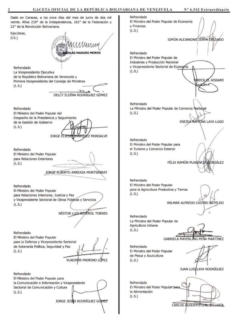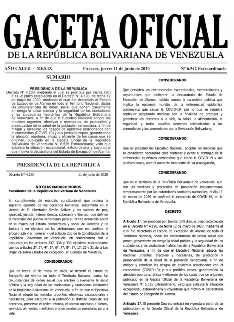 «Decreto No 4.230, mediante el cual se prorroga por treinta (30) días, el plazo establecido en el Decreto N° 4.198, de fecha 12 de mayo de 2020, mediante el cual fue decretado el Estado de Excepción de Alarma en todo el Territorio Nacional, dadas las circunstancias de orden social que ponen gravemente en riesgo la salud pública y la seguridad de los ciudadanos y las ciudadanas habitantes de la República Bolivariana de Venezuela, a fin de que el Ejecutivo Nacional adopte las medidas urgentes, efectivas y necesarias, de protección y preservación de la salud de la población venezolana, a fin de mitigar y erradicar los riesgos de epidemia relacionados con el coronavirus (COVID-19) y sus posibles cepas, garantizando la atención oportuna, eficaz y eficiente de los casos que se originen, publicado en la Gaceta Oficial de la República Bolivariana de Venezuela N° 6.535 Extraordinario; visto que subsiste la situación excepcional, extraordinaria y coyuntural que motivo la declaratoria del Estado de Excepción de Alarma», cita la GO.