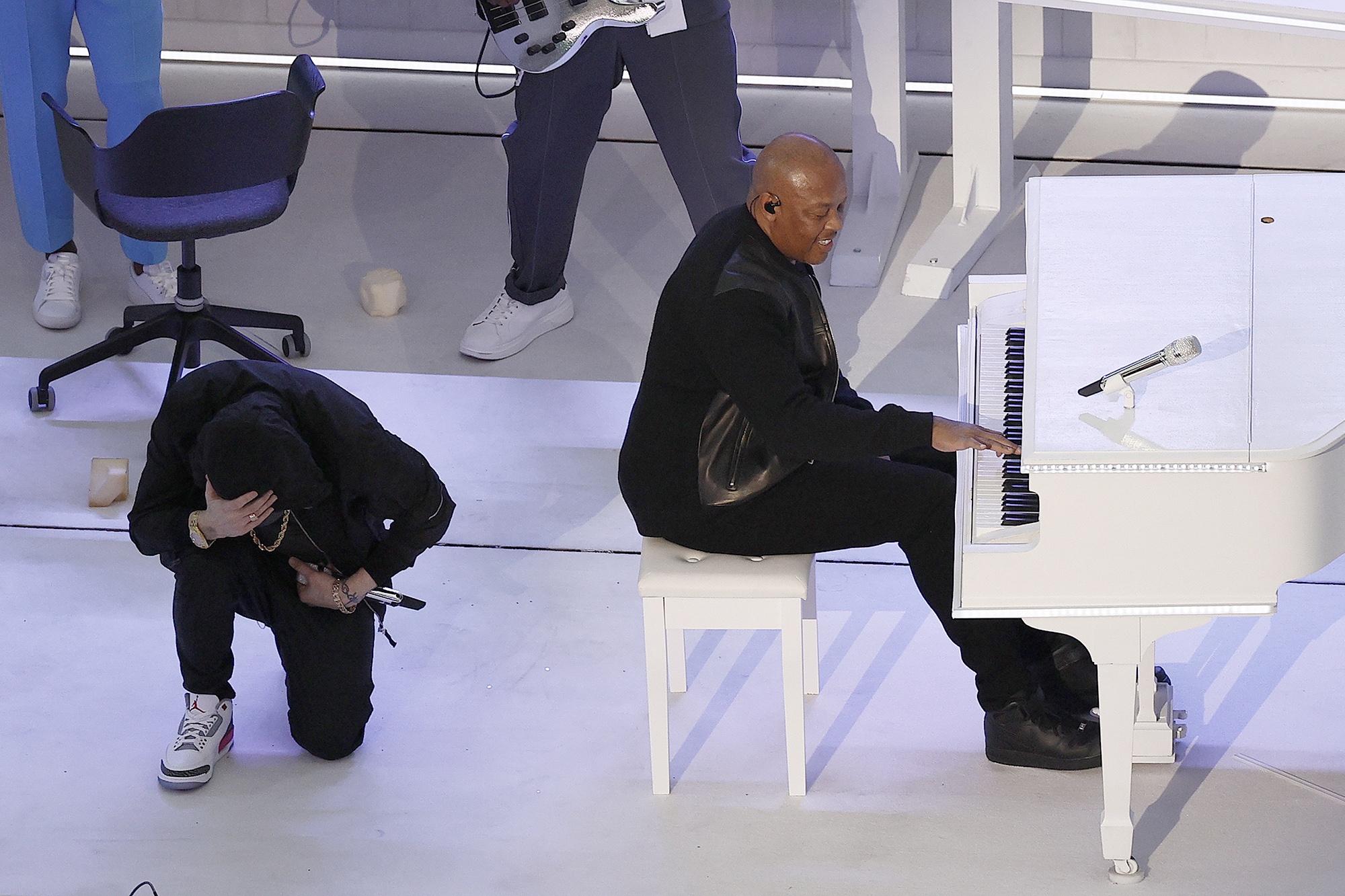 Por su parte, Dr. Dre no omitió la línea «Still not loving police» a pesar de que la NFL le pidió que la suprimiera o tarareara para la transmisión. El productor hizo caso omiso de la solicitud.