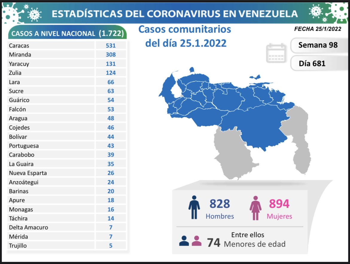 Este martes 25 de enero se cumplió el día 681 de pandemia en Venezuela y la nación reporta en las últimas 24 horas 1.736 nuevos contagios por covid-19, 1.722 casos de transmisión comunitaria y 14 importados; además de 4 muertes. Así lo informó la vicepresidenta ejecutiva de la república, Delcy Rodríguez, vía Twitter.